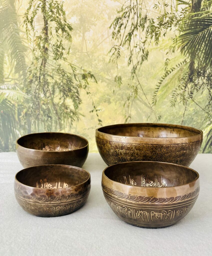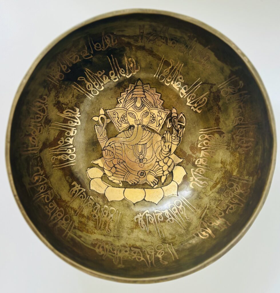 Je me souviens de mon propre choix, en Inde. Je suis entrée dans une boutique tenue par un thérapeute. Devant moi, une multitude de bols reposaient en silence. Je pensais repartir avec un ou deux instruments, et finalement ce sont trois bols qui m’ont appelée, chacun à sa manière. Leurs chants m’ont enveloppée, leurs décorations m’ont touchée : deux ornés de mantras tibétains et de fleurs de vie, un autre dédié à Ganesh, symbole de chance, d’abondance et de protection.