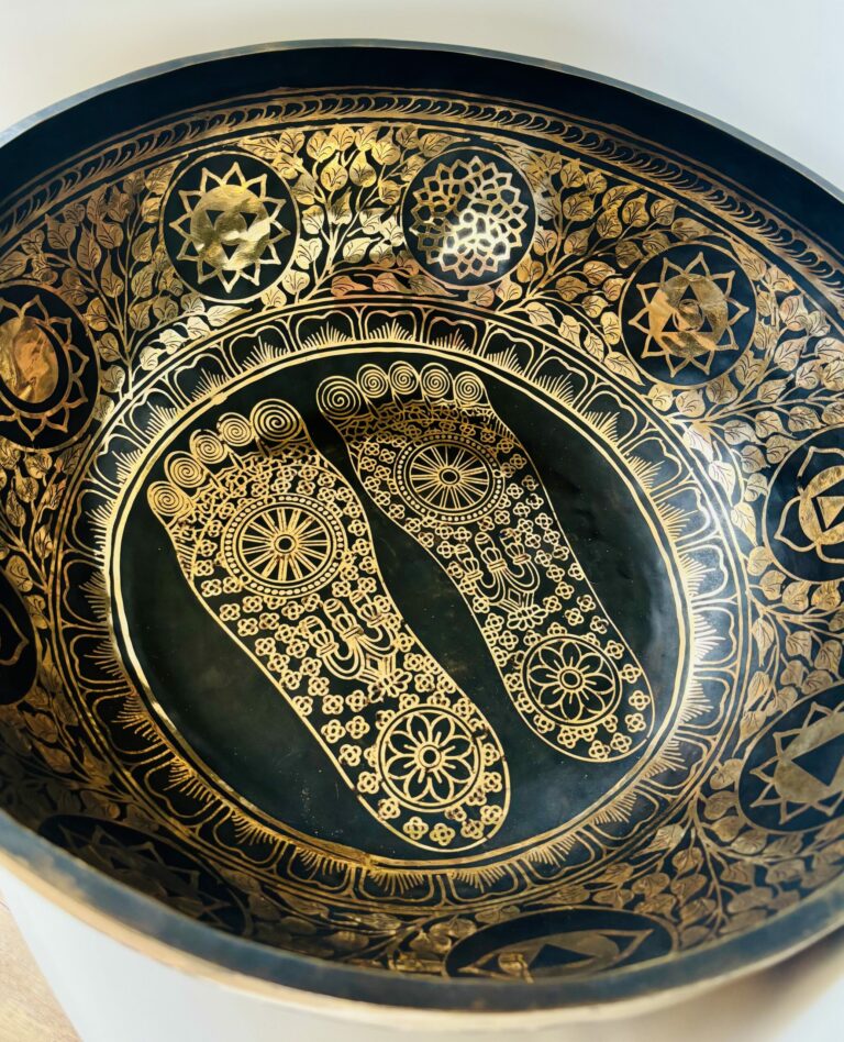 Des artistes tracent à la cire noire des mantras ou des symboles sacrés. Le passage dans l’acide révèle ensuite les motifs, donnant un bol dont la voix est ample, subtile, riche en harmoniques.