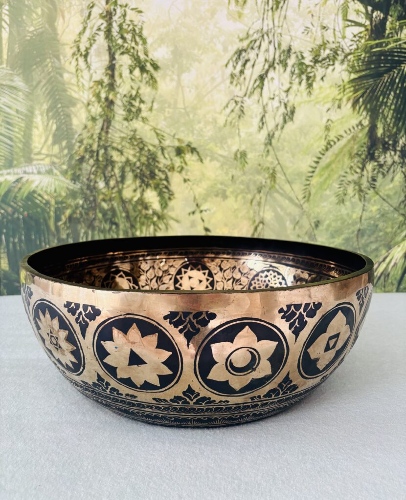 Ces bols possèdent une vibration profonde, large, enveloppante. Ils ont une puissance qui traverse la matière, qui entre en résonance avec les tissus, les muscles, les os. Un tel bol est un allié précieux, il porte une force tranquille, une présence qui ancre et réharmonise.